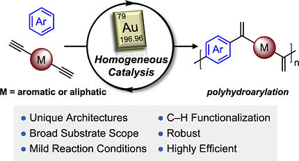 Homogeneous gold catalysis enabled the C−H functionalization polycondensation of alkyne-containing comonomers and heteroarene nucleophiles (see scheme). The polymerization is broad in scope and proceeded with remarkable efficiency to produce high molecular weight aromatic copolymers. These results highlight the untapped utility of gold in the construction of new macromolecular systems.